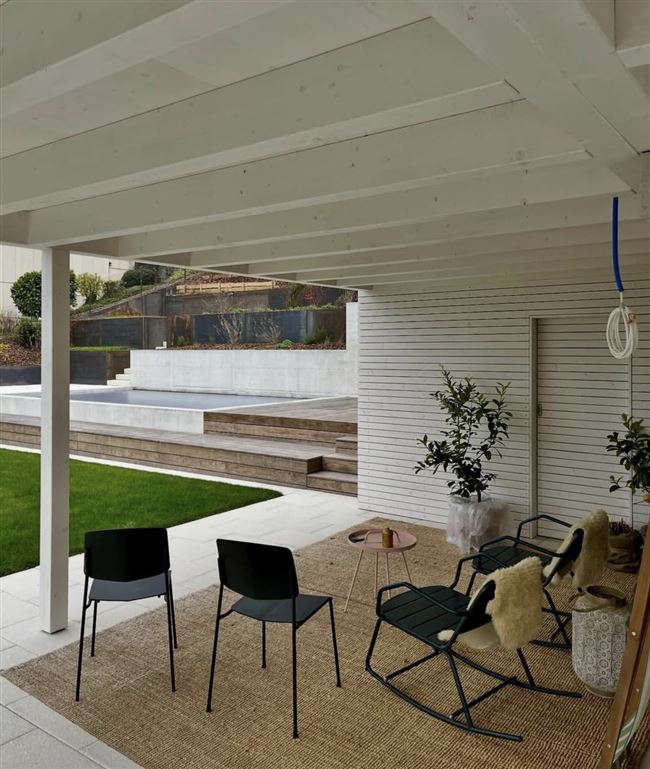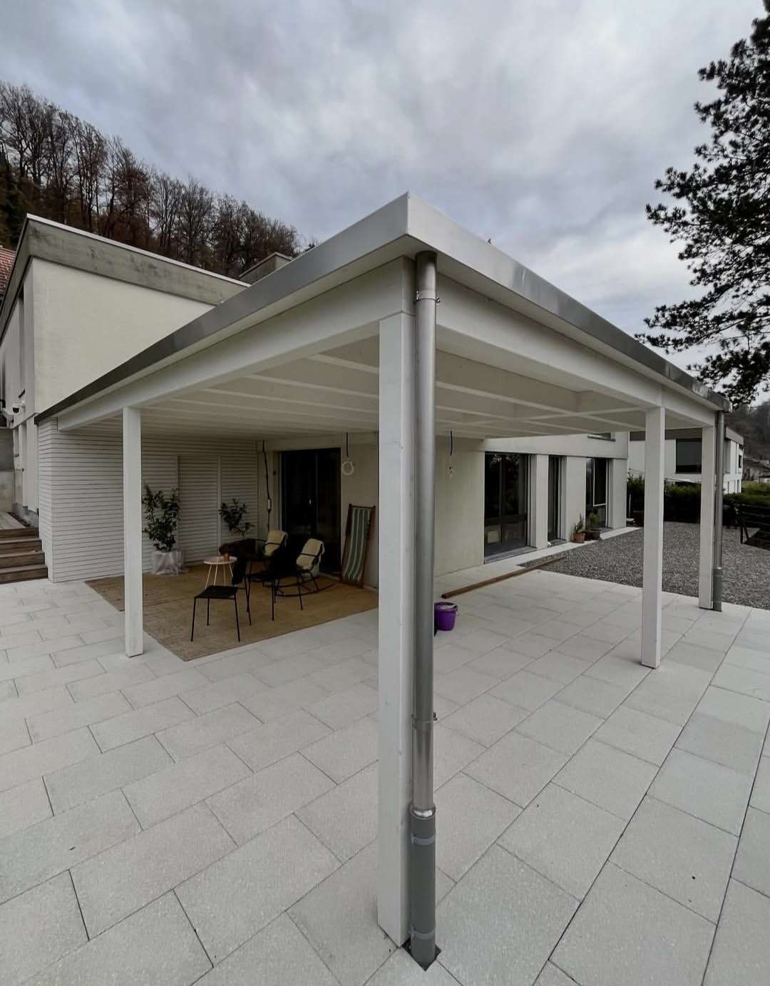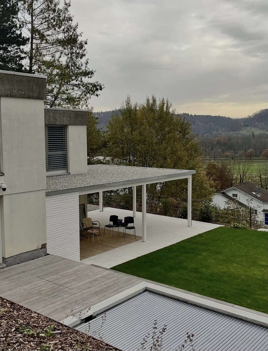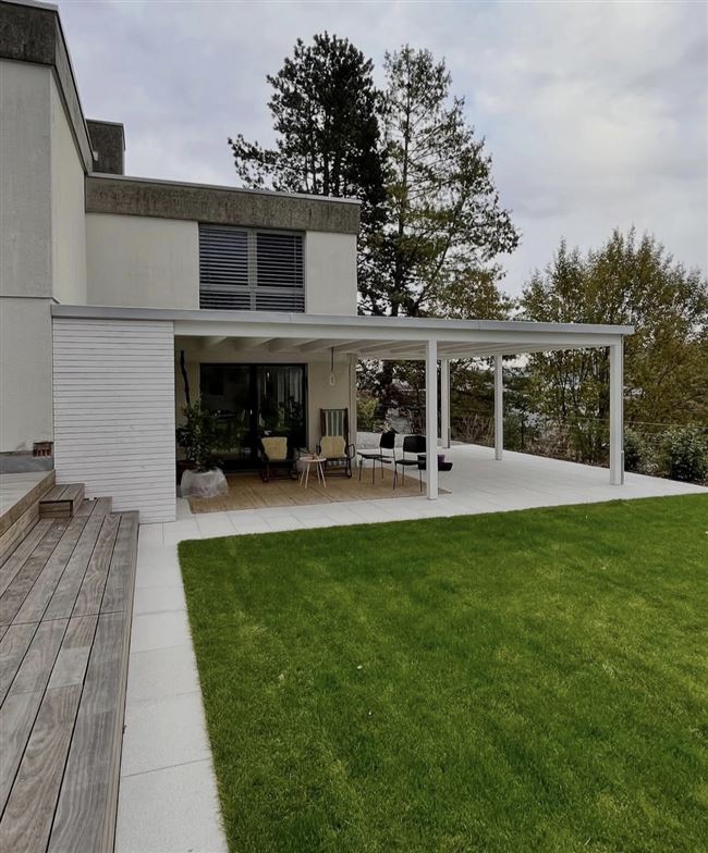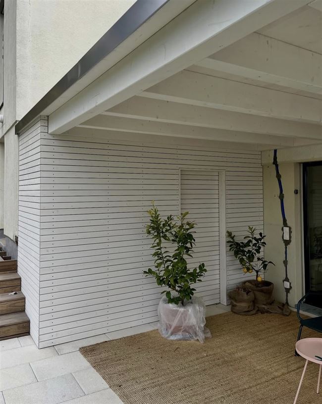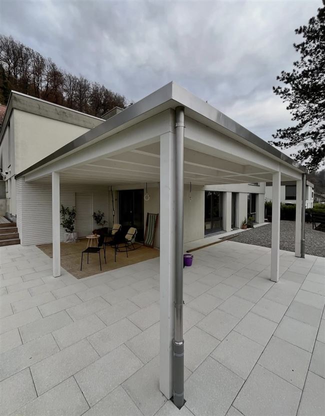 Diese Sitzplatzüberdachung durften wir zeichnen und aufrichten. Der Geräteraum wurde mit einer offener Rhomboidschalung verkleidet. Durch die platzsparende Schiebetür ist dieser einfach zu betreten.