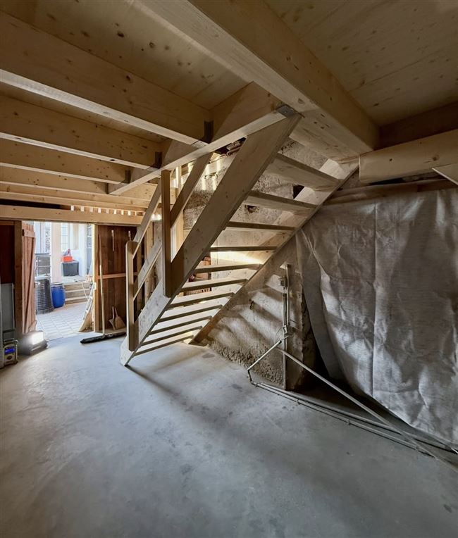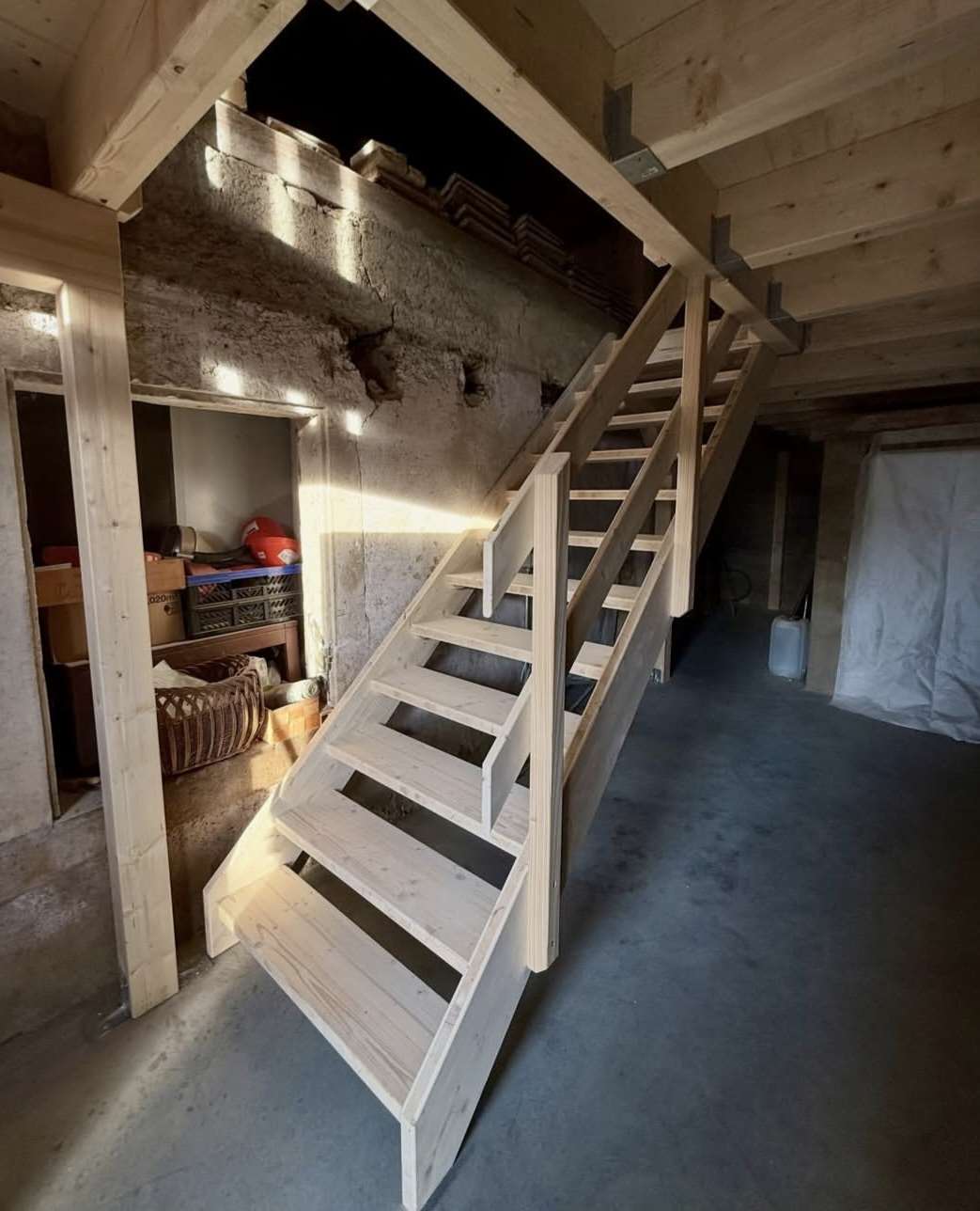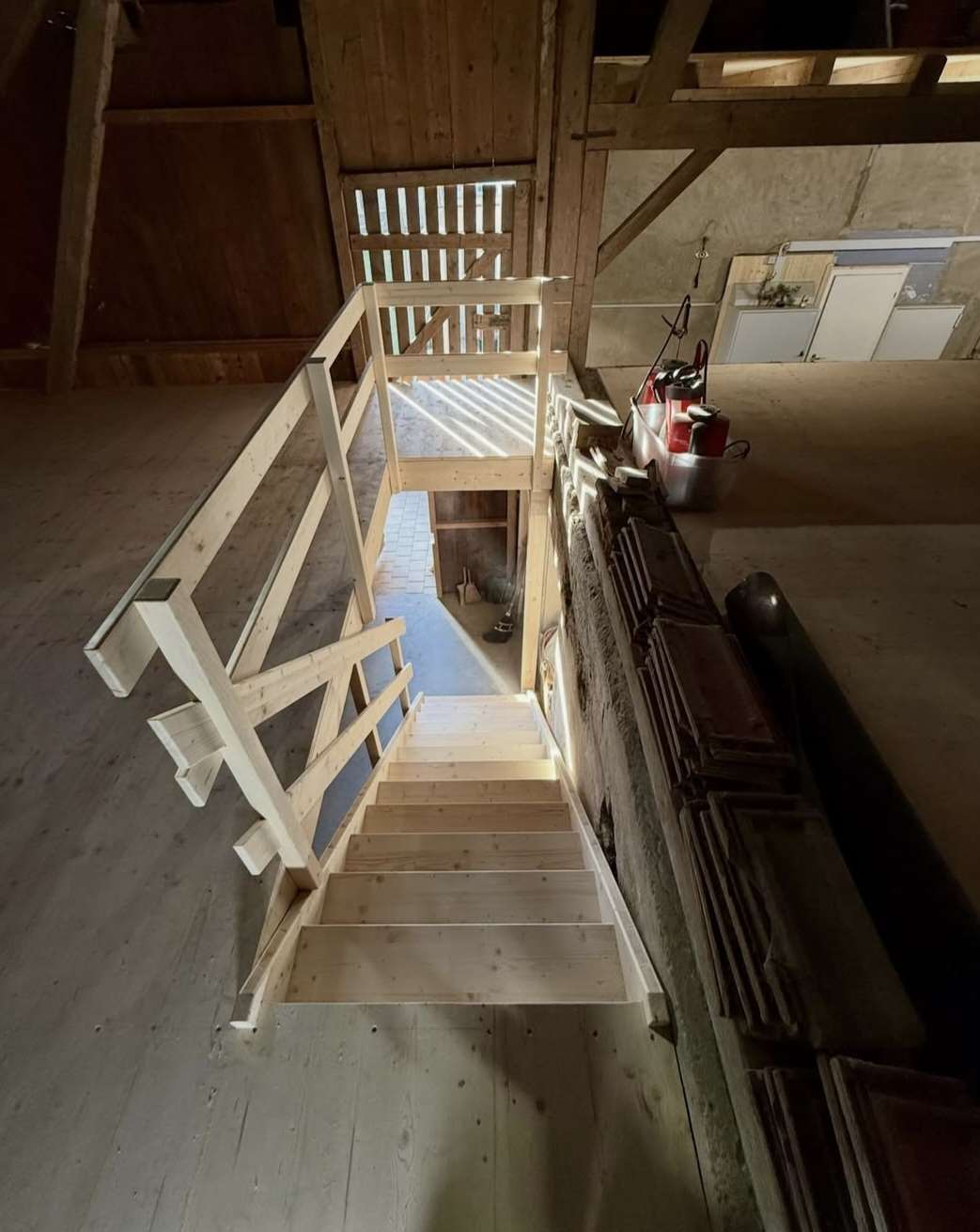 In dieser Scheune wurde eine Balkenlage eingebaut, darauf einen Boden aus Dreischichtplatten. Für den Aufstieg erstellten wir eine massgefertigte Treppe